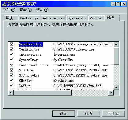 修改Windows注册表的设置,让网页随系统运行而自动启动。禁止这种恶意网页的自动启动也很简单。方法是单击“开始”菜单中的“运行”命令,在打开的运行窗口中输入“msconfig”,单击“确定”,在随后弹出的“系统配置实用程序”对话框中单击“启动”标签,即可看到所有自动启动的应用程序(图1)。这里一定有你最不愿见到的那个恶意网站的网址,只要在这个恶意网站的网址前点一下鼠标左键,取消前面的小钩,然后单击“确定”就万事大吉了。
