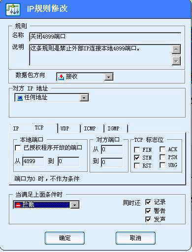 如果暂时没有找到打开某端口的服务或者停止该项服务可能会影响计算机的正常使用,我们也可以利用防火墙来屏蔽端口。以天网个人防火墙关闭4899端口为例。打开天网“自定义IP规则”界面,点击“增加规则”添加一条新的规则,在“数据包方向”中选择“接受”,在“对方IP地址”中选择“任何地址”,在TCP选项卡的本地端口中填写从4899到0,对方端口填写从0到0,在“当满足上面条件时”中选择“拦截”,这样就可以关闭4899端口了(图1)。其他的端口关闭方法可以此类推。