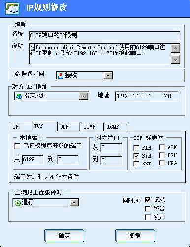 可以说几乎每种远程管理软件都有它的问题,如本报43期G12版介绍的强大的远程管理软件DameWare NT Utilitie。它工具包中的DameWare Mini Remote Control某些版本也存在着缓冲区溢出漏洞,黑客可以利用这个漏洞在系统上执行任意指令。所以,要安全地远程使用它就要进行IP限制。这里以Windows 2000远程桌面为例,谈谈6129端口(DameWare Mini Remote Control使用的端口)的IP限制:打开天网“自定义IP规则”界面,点击“增加规则”添加一条新的规则。在“数据包方向”中选择“接受”,在“对方IP地址”中选择“指定地址”,然后填写你的IP地址,在TCP选项卡的本地端口中填写从6129到0,对方端口填写从0到0,在“当满足上面条件时”中选择“通行”,这样一来除了你指定的那个IP(这里假定为192.168.1.70)之外,别人都连接不到你的电脑上(图4)。