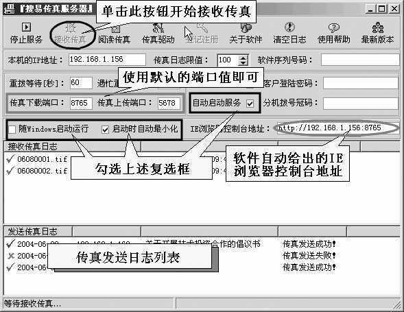果冻提示 我们可以让服务器端的搜易传真服务器软件一启动便进入传真接收状态,这样便不会错过重要的传真了。在软件主界面上勾选“随Windows启动”、“启动时自动最小化”、“自动启动服务”等选项,这样每天一开机传真服务器便会开始工作。当然,前提条件是调制解调器要保持电源接通状态。