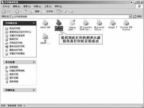 果冻提示 如果虚拟打印机安装成功,那么我们可以在任务栏上依次点击“开始→设置→打印机和传真”,在打印机文件夹内可以看到一个名为APF Fax Printer的打印机(图2)。