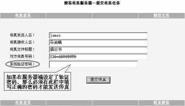 果冻提示 为了避免乱发传真导致资源浪费,可以在传真服务器的主面板上设定登录密码。这样,如果在图4所示的页面中没有填入正确的系统验证密码,服务器将会拒绝发送传真。