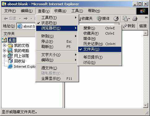 为了能在普通账号状态下,以Administrator身份对服务器进行全面的管理和维护。你可以先按上面的办法,运行IE浏览器程序,然后在IE菜单栏中依次点击“查看→浏览器栏→文件夹”,这样在IE窗口中就会出现Administrator账号状态下的文件夹目录(图2)。如此一来,你就能够以管理员身份对服务器进行各种操作和维护了。如运行程序、移动文件夹、删除文件夹、复制文件、设置虚拟内存等。可以毫不夸张地说,你几乎能够完成管理员可以进行的所有操作。