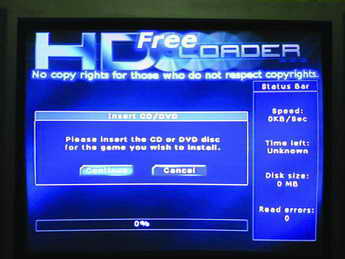 首先装入刻录好的HDLoader引导光盘,启动PS2主机后提示找到硬盘,并要求进行格式化硬盘。此时按下手柄上的×键开始格式化(格式化的过程非常快)。然后就进入HDLoader操作主界面,选择菜单中的“Install”选项,提示插入游戏光盘(图6),这时我们将HDLoader光盘退出来,装入游戏光盘,选择“Continue”,HD Loader会要求用字母或数字组合给要装入的游戏取名,选择“End”开始拷贝。在本人的机器上一般一张游戏碟的拷贝时间为25~30分钟左右,该时间与主机光驱读盘能力有关。