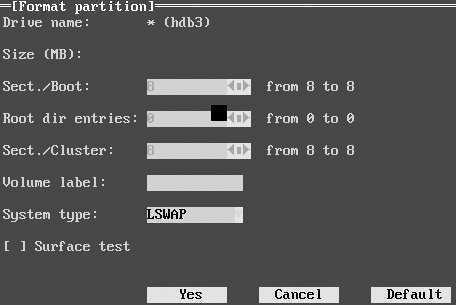 然后,选择分割出的自由空间,点“Create”,再点“Yes”,询问你“You will have more than one primary paratition。Do you really want to perform the operation?”,选“Yes”。接着,选择此分区,将它格式化为为SWAP分区,如图3。