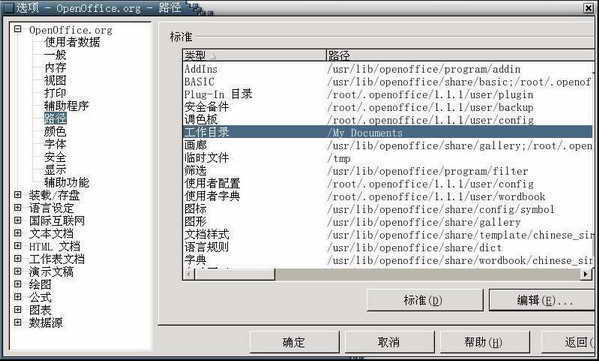 在OO中设置个人主目录,只需选择菜单“工具→选项→OpenOffice→路径”,然后在选项对话框右侧的标准列表框中选中“工作目录”(图3),单击下方的编辑按钮,随后会出现一个类似打开文件的对话框,通过该对话框右上方的三个控制按钮,找到自己要设置为工作目录的文件夹,确定后即可生效。
