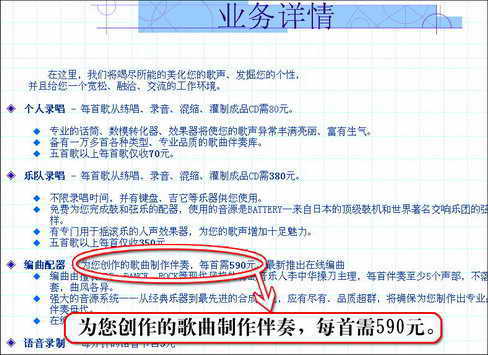 上回介绍了利用Cool Edit Pro 2.0制作非一般的翻唱歌曲,然而要翻唱,歌曲伴奏是必不可少的。上回的伴奏是通过上网下载来完成的,这对喜欢有自己特色伴奏的人来说,显然没有个性。怎么办呢?当然是自己制作伴奏了,不仅有自己的个性,还可以用它来赚钱。而且不要小看了音乐伴奏,以往它只是单纯应用在我们自己的翻唱上面,而如今随着网络上越来越多的人开始热衷于推出自己的翻唱作品,对音乐伴奏也产生了巨大的需求。有时候一个有特色的音乐伴奏往往能卖出一个好价钱。看看图1的网站报价,你就知道这是一个诱人的行业。下面我还是首先来介绍如何自己动手制作伴奏吧。