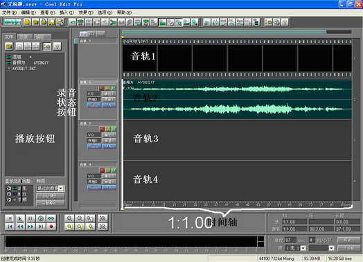 1.启动Cool Edit Pro 2.0,进入多轨界面(如果Cool Edit Pro 2.0自动进入了单轨界面,请点击图2左边第1个按钮返回多轨界面)。