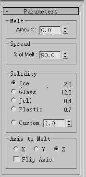 另外你还可以通过Axis to Melt(熔化轴)区选择在X、Y、Z任意一个轴方向上熔化,也可以选中Flip Axis(镜像轴)选项以颠倒熔化效果的方向。