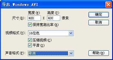 在弹出的对话框中可以改变影片画面的高度和宽度。如果动画中插入有声音也可选择声音格式,其他的选默认值即可,然后点击“确定”按钮。