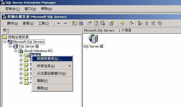 首先,安装好SQL Server 2000 的服务器端和客户端程序。注意,SQL Server的服务器端程序只能安装在WinNT或Win2000 Server上(以下的操作系统都指Win2000 Server)。SQLServer服务器正常运行时,在屏幕的右下角,有一个图标,带有一个绿色的小三角符号。点击“开始/程序/Microsoft SQL Server/企业管理器”,在目录树中展开名称为“控制台根目录”的目录。在标有“数据库”的目录项上点击鼠标右键,再点击“新建数据库”(如图1)。