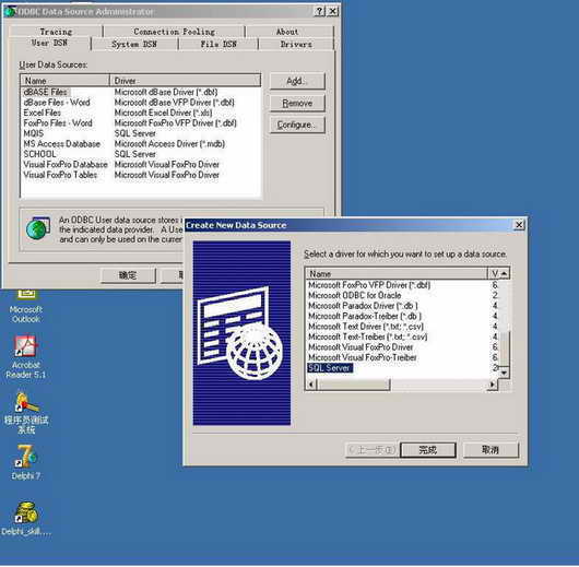 在完成了数据库的配置后,接下来就要设置ODBC数据源。打开“开始/设置/控制面板/管理工具/数据源(ODBC)”,在“User DSN”下,点击“Add”选择“SQL Server”项(如图2),再点击“完成”按钮。根据提示,输入数据源名称,如“TEST_ODBC”和SQL Server 服务器名称。在后面的页面中可以直接点击“下一步”到最后一页,再点击“Test Data Source…”检测ODBC设置是否正确。如果正确,显示“TESTS COMPLETED SUCCESSFULLY!”的信息。