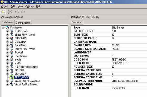 接下来要设置数据引擎,这里采用的是Delphi的BDE。打开“开始/程序/Borland Delphi7/BDE Administrator”。在“Databases”页面下,可以看到,刚才设置的ODBC数据源“TEST_ODBC”,鼠标右键点击该项,选择“Open”,出现输入“User Name”、“ Password”的对话框,输入用户名Administrator及密码后点击“OK”使它有效。这时,如果连接正常,右侧的项目名称的字体变成粗体,如图3。注意:如要修改参数值,应先鼠标右键点击左侧的数据库名称,选择“Close”,在修改参数值后,用鼠标右键点击左侧的数据库名称,选择“Apply”保存,再选择“Open”使新的参数值生效。