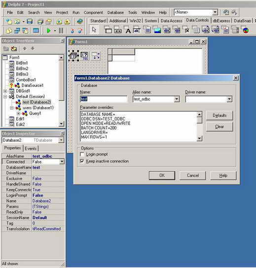 双击Database组件,出现Database参数设置对话框,在Alias Name中选择或输入刚才BDE Administrator中新建的数据库名称,在本例中是TEST_ODBC,在Name中为它输入一个新的名称,如“TEST”,再点击“Defaults”,如果不想以后频繁输入用户名和密码,可以在参数项Password中写入密码并确定Login prompt项没有选中。在Connected属性中,设置为“True”,连接SQL Server。
