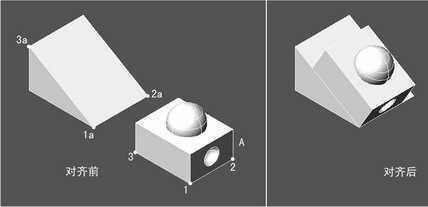 对齐原理解释:在对齐时,需要点6个点,1点将与1a点进行点对齐,1-2点的连线将与1a-2a点的连线进行线对齐,1-2-3点形成的面将与1a-2a-3a点形成的面进行面对齐。实际上,对齐命令是一个非常好的面对齐,显然无论对齐前物体的状态有多么复杂。