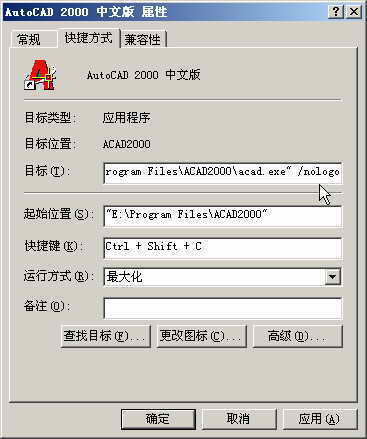 AutoCAD在启动时,也会显示“闪屏”,其中显示的是AUTODESK公司的徽标。如果想不让它出现,你可以在桌面上AutoCAD的启动快捷方式上做文章:右键单击桌面上的AutoCAD图标,单击快捷菜单中的“属性”,单击“快捷方式”选项卡,在“目标”中,于文本的最后加上“ /nologo”,“/”前有一个空格键(如图),单击“确定”按钮。