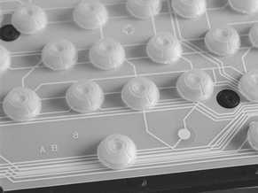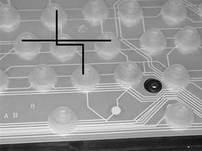 5.电容式键盘因其特殊的结构,易出现电脑在开机时自检正常,但其纵向、横向多个键同时不起作用(如图3),或局部多键同时失灵的故障现象。此时应拆开键盘外壳,仔细观察失灵按键是否在同一行(或列)电路上。若是金属印制线路又无断裂,则是连接的金属线条接触不良所致。拆开键盘内电路板及薄膜基片的连接(如图4),把两者连接的金属印制线条擦净,之后将两者吻合好,装好压条并压紧后故障即可排除。