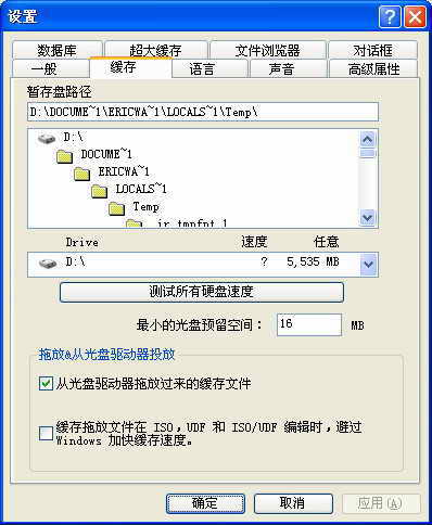 一般DVD刻录机都附带Nero这款刻录软件,在这里笔者以Nero为例进行设置。首先启动Nero这款软件并进入其主界面,依次点击“文件→设置→缓存”,在这个界面下设定硬盘的特定分区作为虚拟缓存的存放位置,建议利用“测试所有硬盘速度”这个按钮来挑选出传输性能最好的分区(如图),这样便可以为刻录成功提供最大的保障。“确定”之后再点击“超大缓存”这个选项卡,利用下拉菜单把“自动设置”更改为“手动设置”,并在下面空白处填入不大于80MB的缓存数值。由于该项设置需要把系统内存虚拟成DVD刻录机缓存,所以容量数值不能超过内存总量的40%,以避免内存不足而出现的死机现象。