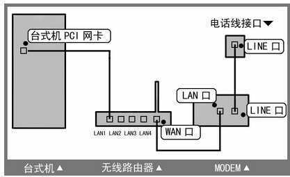 ADSL Modem LINE接口仍然连接宽带接入电话线,用网线将ADSL Modem的LAN口与路由器的WAN口进行连接。然后再用网线将无线路由器的LAN1口(IP806LM宽带路由器具有四个LAN接口)与台式机的PCI网卡接口相连(网络连接如图1所示)。