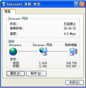 5.选取“控制面板→网络连接”,在“Internet网关”处右击“Internet连接”,在弹出的菜单中选择“连接”。OK,连接成功。双击连接图标可以查看目录连接状态(图3)。