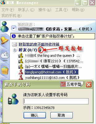 这时你首先需要将好友与他的手机进行绑定,右击好友头像选择“修改手机号码”,为该好友输入手机号码后便可,这时此好友的头像上会出现一个小手机图标,完成绑定(见图)。