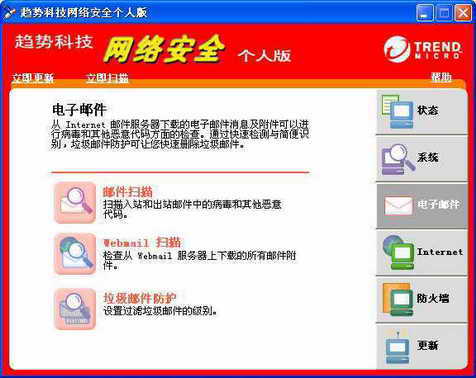 虽然主流的邮件客户端大都具有反垃圾邮件的功能,但笔者打算用趋势科技网络安全个人版实现这一目的,因为它的功能更为丰富、全面。用鼠标右键点击系统托盘上的趋势科技网络安全个人版图标,在弹出菜单中选择“打开主窗口”,弹出主界面。再点击右侧的“电子邮件”按钮,显示如图所示界面。