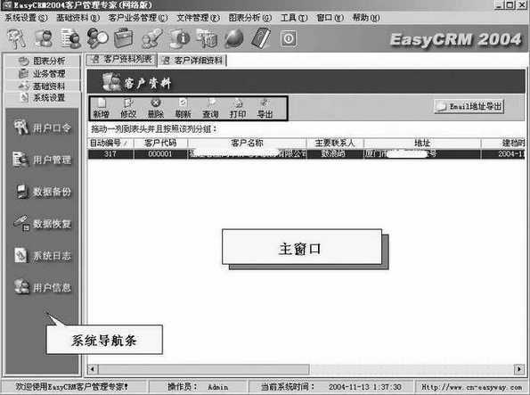 第一次在服务器端使用EasyCRM2004时,我们以初始用户名Admin和初始密码111111登录后即可以管理员身份进入软件主界面了(图1)。建议大家在登录后就单击“口令管理”修改管理员密码。