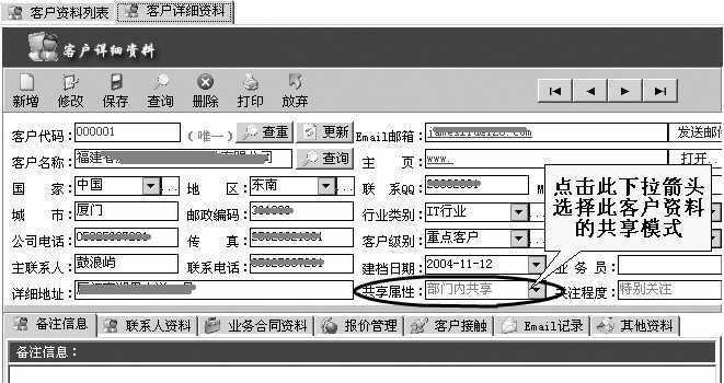 登录EasyCRM2004,在菜单栏上依次单击“客户业务资料→客户资料”进入客户资料窗口。单击窗口上方的“新增”图标,打开“客户详细资料”对话框。填入客户的详细资料后,点击“共享属性”旁的下拉箭头可以选择相应的共享模式。如果你希望这个客户资料能够为本部门的其他同事所了解,就可以选择“部门内共享”(图2)。最后,单击“保存”按钮即可将资料上传至服务器端的数据库文件中了。