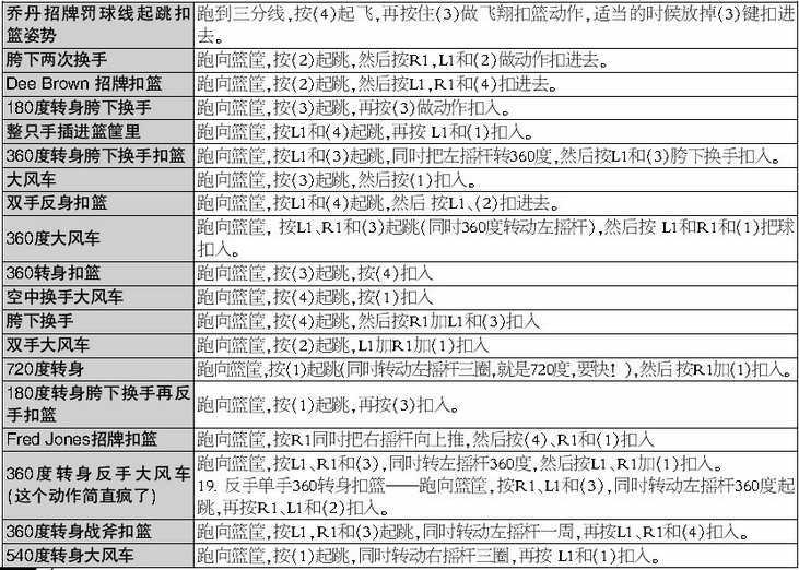 下面附上NBA2005扣篮出招表(很像格斗游戏吧),由后街男孩根据xxxunknownxxx的出招表整理翻译。在这里给大家过过瘾!