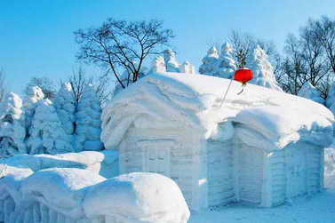 拍摄技巧:拍摄时要注意突出雪雕,测光时要注意其他景物的对比和光线色彩,才能使白色的雪雕显得没那么单调。