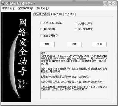 有人说兴趣是最好的老师,此话不假。当我轻松拿下几台服务器的管理员权限的那一刻,我便开始关注网络安全技术了。由于小时候学过计算机的缘故,所以上手很快,经过两年的学习研究,也算是一个scripts boy(脚本男孩)了。由于网络安全技术的不断普及,像过去那样简单地入侵服务器是不太可能的,所以我又开始学习编程,试图将复杂的手工入侵编写成能自动运行的程序。或许是因为经常在一些杂志发表文章的缘故,有些做虚拟空间的朋友让我帮他们设置服务器安全。手工一个个设置,实在很麻烦,所以我干脆写了个网络安全助手服务器版。后来网上开始流行各种蠕虫病毒,不少朋友都中了招要我帮忙,便在2004年9月又写了针对蠕虫攻击的网络安全助手个人版2.0。由于不少朋友是先中了蠕虫然后才想到用相应软件来加强安全的,所以根据网友的建议,我在软件原来的基础上又加入了蠕虫专杀工具和一个组策略包,以及IE设置,形成了现在的4.0。这样先杀后补,基本上可以确保机器不容易受到蠕虫的侵害。
