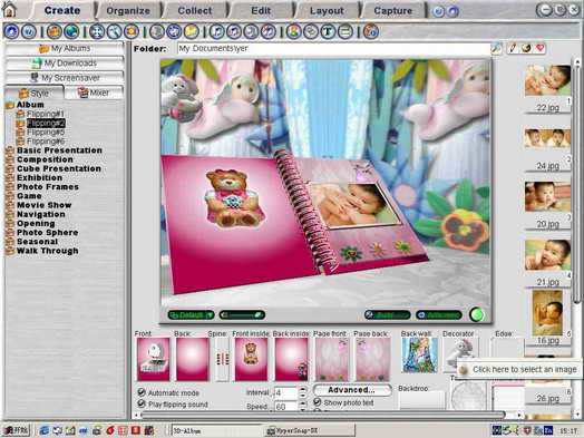选择主菜单“Create”命令开始建立3D相册,在这里切换到“Style”子项后,我们看到系统展开了种类繁多的模板资源树,这里我打开了“Album”类选了一个模板,预览窗立即出现了一格惟妙惟肖的3D动画宝宝相册(图1),下面开始我们的详细制作步骤。
