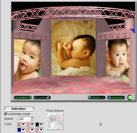 将准备好的照片一股脑导进去,在窗口底部分别选择并设置“Frame”(相框)、“Wall”(墙壁)、“Floor”(地板)、“Ceiling”(天花板)和“Column”(立柱)的材质和种类,并将“Speed”设置为40,“Reflection”设为20,控制好旋转速度,一个宝宝照片馆就这样搭起来了(图2)。