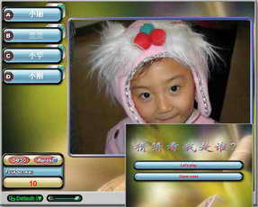 点击预览出现游戏界面,它会按你设定的时间,以三维方式轮番在屏幕上显示照片,画面左上角给出四个姓名预选钮,你在规定的时间内选对了,会给予语音提示并且加分,选错会扣分并给出正确答案。我最后把制作出来的游戏送给了大院里几个本来互相还不太熟悉的小朋友,通过玩这个游戏,他们很快就成了好朋友。