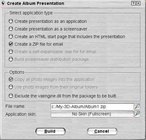 3D Album PicturePro的共享版本对导出格式做了限制,只能导出网页格式、屏保格式和打包压缩格式,不能直接导出可执行的EXE文件格式。我选择了“Create a ZIP file email”格式进行制作,它会默认自动生成一个名为“Album1”的ZIP格式的压缩包,解开后执行里面的“Album1”可执行文件,就会演示你的3D动画相册了。