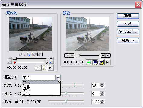 从“程序”中运行Video Editor,新建一个Mpeg-1文件,从时间线上导入需要处理的视频文件:点击“插入视频文件”图标(图1),从弹出的对话框中选中文件后,点击“确定”,把鼠标在视频轨道上点击便可插入文件。再点击时间线工具栏上的“插入视频滤镜” ,便弹出“视频滤镜”选择对话框。选择“Brightness && Contrast”,按“添加”,便出现在“应用滤镜”中,点按“选项”按钮,弹出图2的对话框,分别对主色、红绿蓝色的亮度和对比度进行设置,从图2上面的预览面板中能清楚地看到最终的效果,满意后按“确定”。