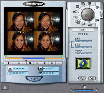 我选中了Kitty的一段镜头,在特效窗口中选择“电视背景墙”模板将它拖至预览窗口中,右侧的参数栏会出现“效果”参数和演示样本动画,接下来设置水平数和垂直数均为2,持续时间为3秒,点击“Apply”钮就可以在预览窗口看到电视墙的效果了(图4)。
