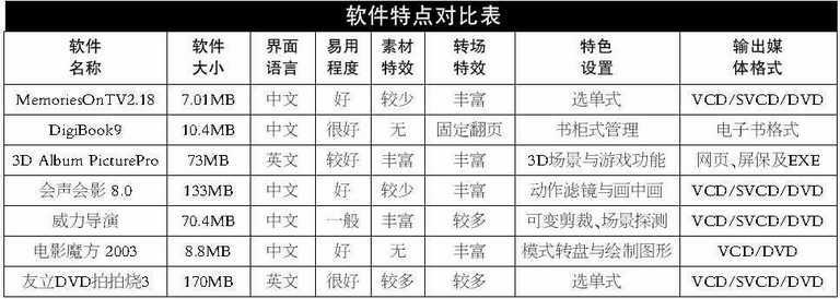 介绍了这么多的数码照片、视频短片的制作软件,相信你也能找到适合你使用的电子相册处理软件了。为了便于大家选择,在附表中我们将各个软件的主要特点都列了出来。