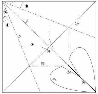 Step2.画一竖线,双击从设置自选图形格式窗口的“大小”标签下输入旋转角度为-22.5°。拖动使其起点对准正方形左上角,按住Shift键拖动调整适当长度②。同样按住Shift键画出直线③④⑤⑥⑦⑨,③⑥⑨必须从交叉点开始画,至于其他的只要位置差不多就可以。用“自选图形”画出弧线⑧。并用两个椭圆画出一个眼睛。