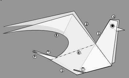 Step3.把尾和翅膀分别从两侧沿⑥向外折,把脚向下略为拉开。