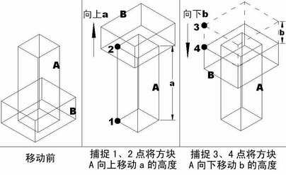 首先将方块B向上移动a的距离(我们可以通过捕捉方块A的端点进行移动,有关移动的方法在第一期已经进行了详细的讲述,在此不做过多赘述),然后再将方块B向下移动b的距离,最后方块B显然被移动到a-b的高度,那么移动的过程如图5所示。