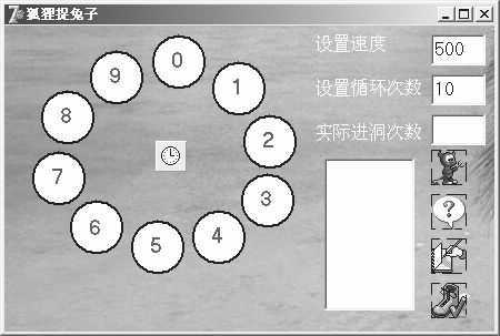打开Delphi,新建一项目,在主窗体上放置10个圆,表示山洞,并用Label做好标记0-9。然后放置一个Timer控件,三个Edit分别用于设置狐狸奔跑速度、设置循环次数、显示实际进洞的次数、一个ListBox用于输出狐狸没有到达的洞,一个开始按钮(如图1)。