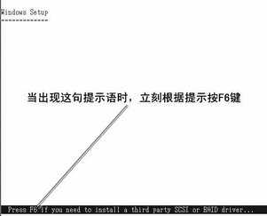 在安装Windows操作系统时,如果是Windows98/Me,则无须加载SATA控制器驱动;如果是安装Windows2000/XP等NT核心系统,当安装画面出现“Press F6 if you need to install a third party SCSI or RAID driver……”这样一段提示语时(图2),立刻根据提示按“F6”键。