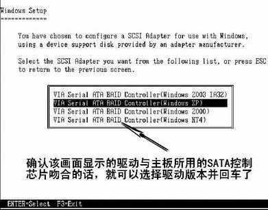 确认驱动软盘插入之后,按回车键,此时安装向导会读取软盘,之后会显示该软盘中的SATA控制器驱动详细信息,例如是VIA的VT8237或VT6410控制芯片的驱动,则会出现VIA字样(图5)。确认驱动与控制芯片吻合之后,根据操作系统的版本选择相应的驱动,然后按回车键,之后按照常规方法安装好Windows即可。