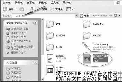 在安装SATA控制芯片驱动的时候,首先要保证一出现提示信息就按“F6”键,否则错过了时机,安装向导就会出现蓝屏错误,此时就要重新执行安装向导了。此外,SATA控制芯片的驱动存放在软盘中的位置非常关键:从网上下载的SATA控制芯片的驱动程序,往往是一个压缩包,解压缩之后,里面包含了很多内容,此时要找到一个名为“TXTSETUP.OEM”的文件,将该文件所在的文件夹中的所有内容拷贝到软盘上,注意要保证“TXTSETUP.OEM”位于软盘的根目录下(图6)。