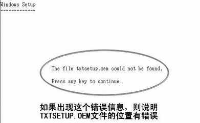 如果“TXTSETUP.OEM”不在软盘的根目录下,则安装向导在搜索软盘后会报告因为找不到“TXTSETUP.OEM”而无法加载SATA控制器的驱动(图8)。