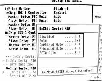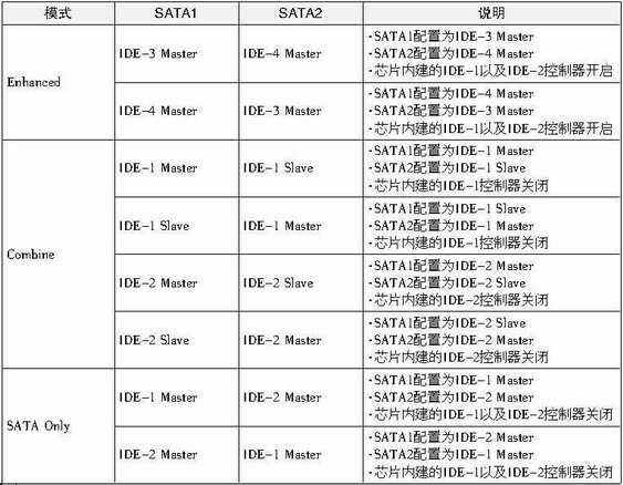 Disable(禁止)、Auto(自动)、Enhanced Mode(增强模式)、Combine Mode(组合模式)、SATA Only(仅仅为SATA模式),图2所示。