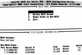 至于ICH5R的RAID功能,也是在同样的位置开启,如图3、图4所示,这时候会自动转换为Enhanced Mode。开启好了以后,系统自检完后会多一个RAID BIOS自检界面,这时按“Ctrl+I”就可以进入RAID BIOS,设置各种RAID功能,如图5。