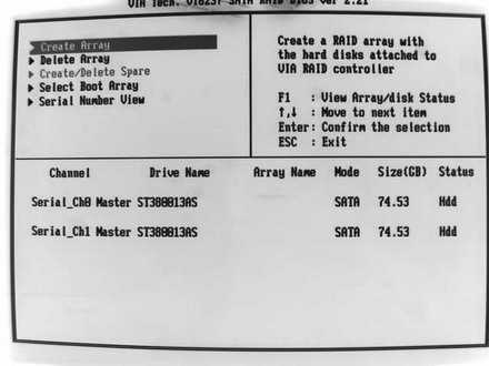 VT8237的SATA功能其实不用在主板BIOS里做任何设置,系统自检过后,和ICH5R一样,会多一个RAID自检界面(图12),只不过快捷键变成了“Tab”而已,这时候已经检测到了SATA接口上的两个硬盘,按“Tab”进入,可以进行各种RAID设置(图13),如果不建RAID,可以直接跳过。