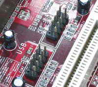 步骤一:首先查看一下主板上有没有USB扩展接口。一般在主板PCI插槽附近能找到一个含两排插针的接口,旁边标注USB的字样(图1)。